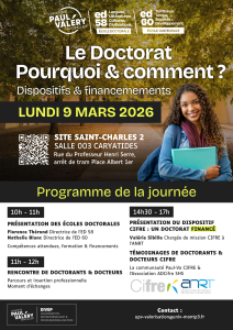Les Écoles doctorales 58 et 60, avec la Direction de la Valorisation, de l’Entrepreneuriat et de la Professionnalisation (DIVEP) de l’Université de Montpellier Paul-Valéry, organisent le lundi 9 mars 2026 une journée d’information intitulée « Le Doctorat : Pourquoi & comment ? ».