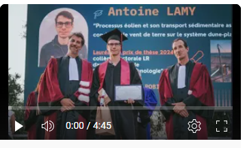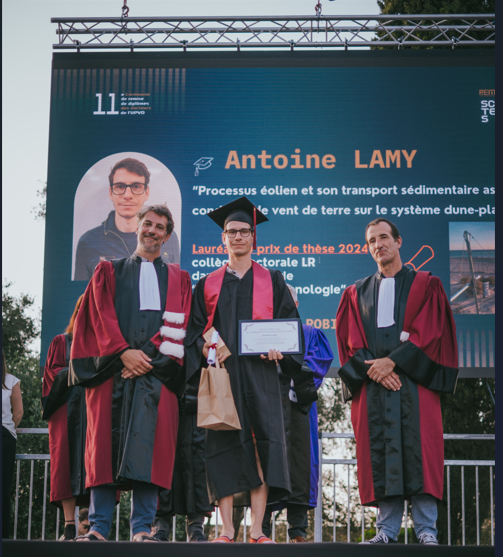 Lors de la cérémonie de remise des diplômes de doctorat à l’PVD, Antoine Lamy a reçu le Prix de Thèse 2024 du Collège Doctoral Languedoc-Roussillon dans la catégorie Sciences et Technologies. Antoine a consacré ses recherches aux effets du vent sur le sable et à la formation des dunes sur la plage de Leucate. Ses travaux visent à accompagner les gestionnaires des littoraux dans la préservation des plages et des écosystèmes côtiers. Ce prix vient saluer l’excellence de ses recherches et leur impact sociétal.