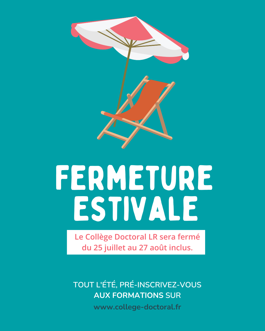 Après une année bien remplie, il est bientôt l’heure pour l’équipe du Collège Doctoral LR de prendre un peu de repos. Le Collège Doctoral sera fermé du 25 juillet au 27 août. Toutes les demandes d’inscription aux formations et aux actions carrière-emploi seront traitées à partir du 28 août. Nous vous donnons rendez-vous, en pleine forme, à la rentrée. Bel été à toutes et tous !