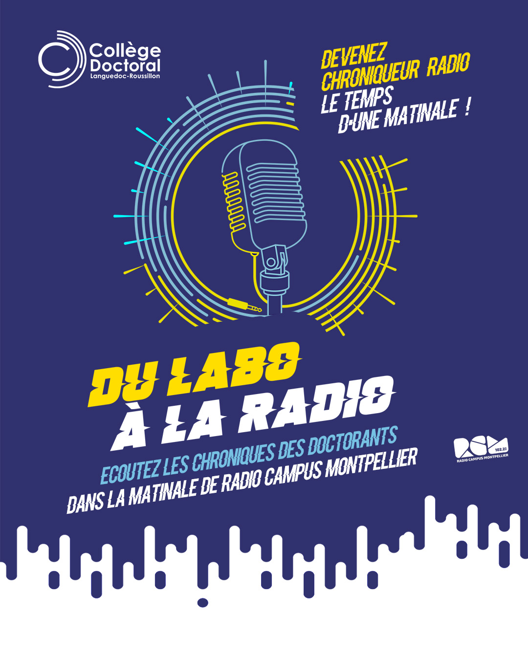 De novembre à juin, chaque vendredi sur Radio Campus Montpellier, des doctorantes et doctorants d’Occitanie-Est, issus de toutes disciplines, ont partagé leurs recherches et leur quotidien sur les ondes. La chronique « Du labo à la radio » tire sa révérence pour cette saison, mais il est toujours possible de (ré)écouter les épisodes en podcast. Tous les épisodes sont disponibles sur le site du Collège Doctoral LR. > Écouter les podcasts